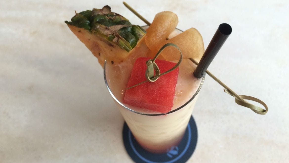 Fill a Collins glass (a long tall glass) with crushed ice. Pour the watermelon shrub over the ice to create the bottom layer of the drink. Then add the pineapple cordial for the middle layer. Pour the shaken rum and coconut milk mixture through a strainer over the ice to create the top layer. Garnish with the pineapple, watermelon cube, and pineapple rind ribbon.