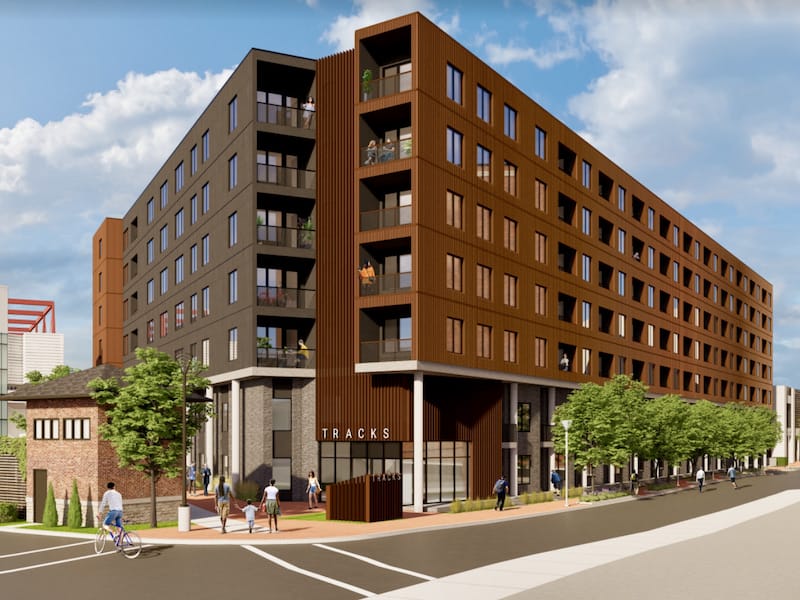 What was then called the Tracks 215 project was first introduced by Bryant in 2019. It originally called for 250 apartments atop a 400-space garage on what’s now a parking lot west of the historic Freight House building.